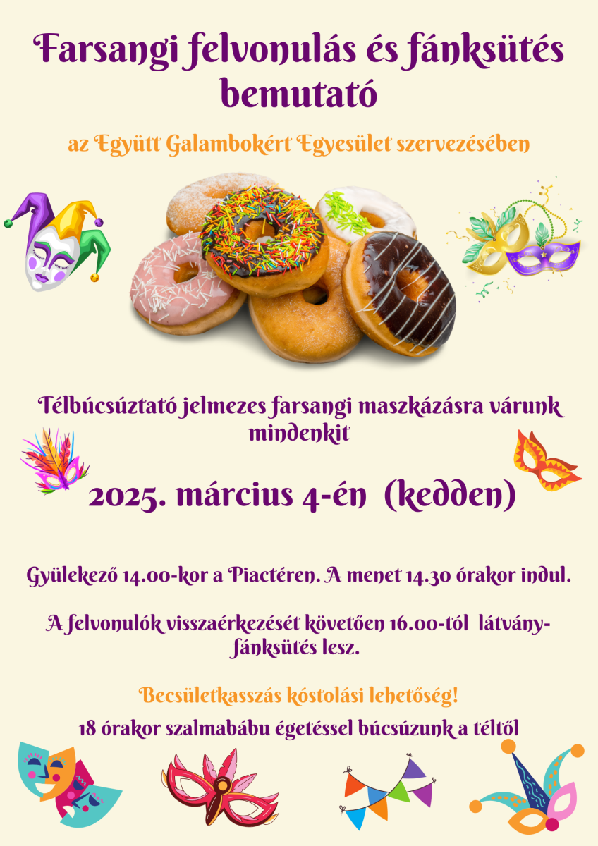 Szeretettel várunk mindenkit 2025. március 4-én kedden egy vidám farsangi felvonulásra, és azt követően látvány fánksütésre!