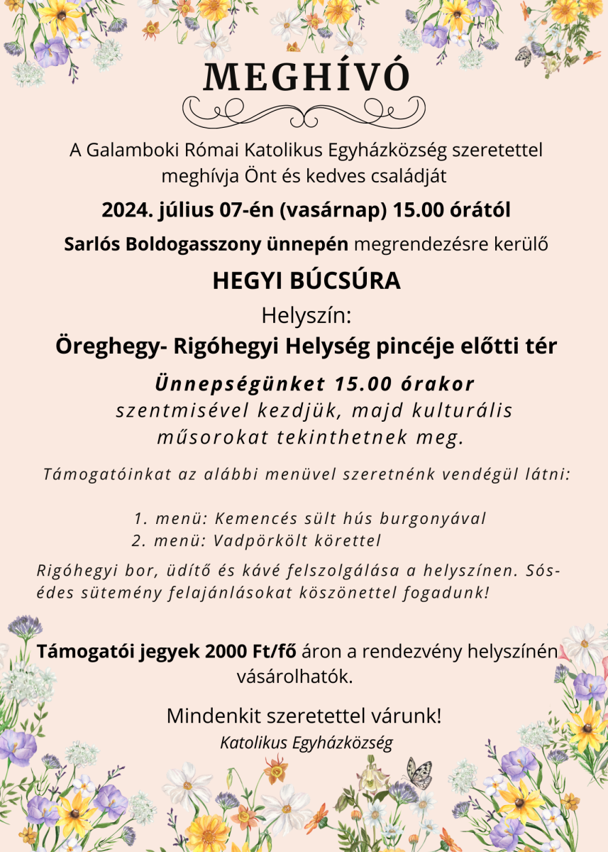A Galamboki Római Katolikus Egyházközség szeretettel várja a település lakosságát Sarlós Boldogasszony ünnepén megrendezésre kerülő Hegyi Búcsúra.